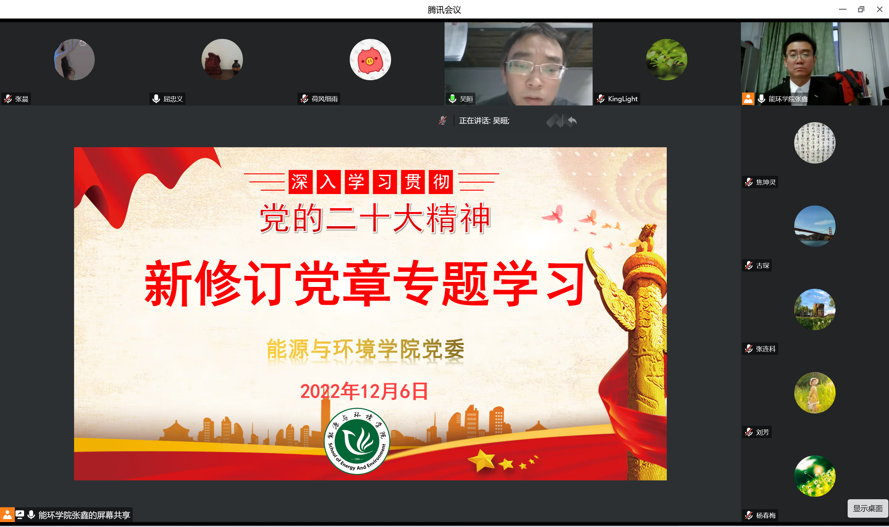 128日下午,能源与环境公司理论中心组集中学习新修订的《中国共产党章程》,公司党委书记张鑫主持,公司党委委员、各党支部书记参会,公司党委委员、副董事长屈忠义旁听指导本次学习活动。本次学习会采取线上腾讯会议形式开展。