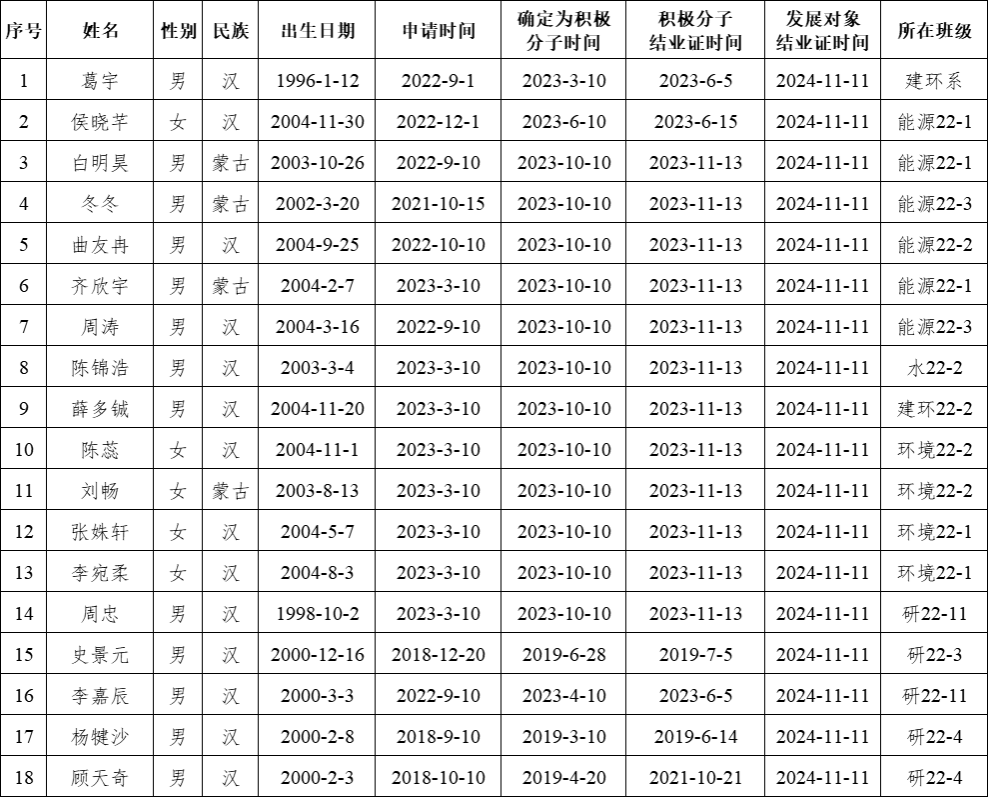 经过一年以上的培养教育和考察,葛宇、侯晓芊、白明昊、冬冬、曲友冉、齐欣宇、周涛、陈锦浩、薛多铖、陈蕊、刘畅、张姝轩、李宛柔、周忠、史景元、李嘉辰、杨犍沙和顾天奇共十八位同志拟接收为中共预备党员(见附表)。为进一步增强发展党员工作的透明度,确保发展新党员的质量,根据《中国共产党章程》和《中国共产党发展党员工作细则》,现将发展对象的基本情况予以公示。