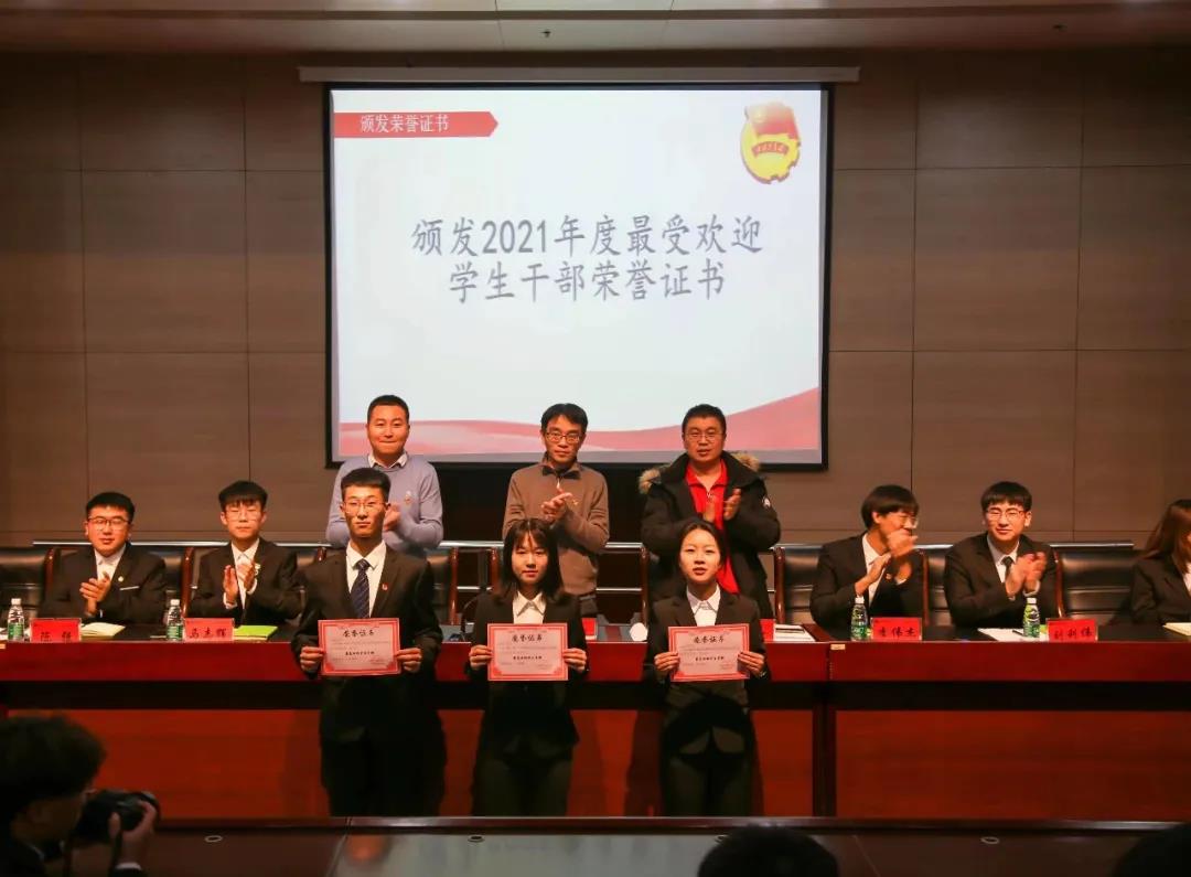 在表彰大会现场,进行了本年度最受欢迎员工干部评选。经过现场全体同学无记名线上投票,最终团总支文体部毕温薪、员工会学习部杨佳丽、青年传媒中心短视频部康佳琪三名同学荣获了“2021年度最受欢迎员工干部”荣誉称号。