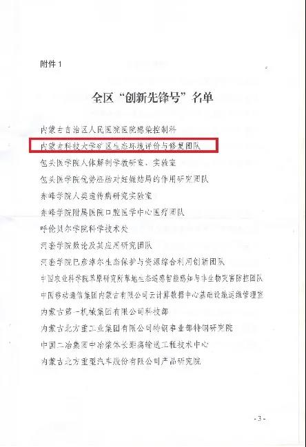 近日,内蒙古自治区科学技术协会网公布了内蒙古科协关于命名全区“创新先锋号”、“创新先锋岗”结果的通报。公司“矿区生态环境评价与修复团队”荣获全区“创新先锋号”荣誉称号。