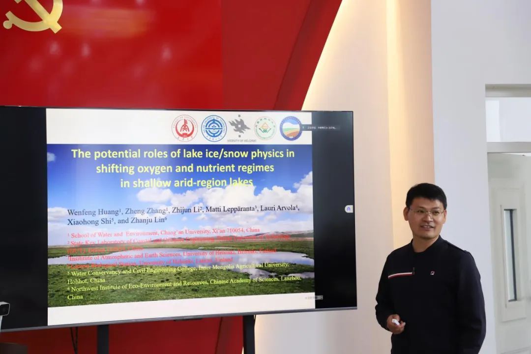 王志超副教授以线上交流的方式就3044永利集团黄河流域寒旱区水土环境研究中心的人员组成、研究方向、研究成果等方面做了细致的介绍,也希望同蒙方达成合作意向;李志军教授进行了中德项目(IceTMP)冰下湖泊冰物理和水生态系统的介绍;杨文焕教授介绍了三水统筹下黄河流域内蒙古段脆弱湖泊的保护与挑战;黄文峰教授作《湖泊冰雪物理在浅层干旱区湖泊营养变化中的潜在作用》的报告。