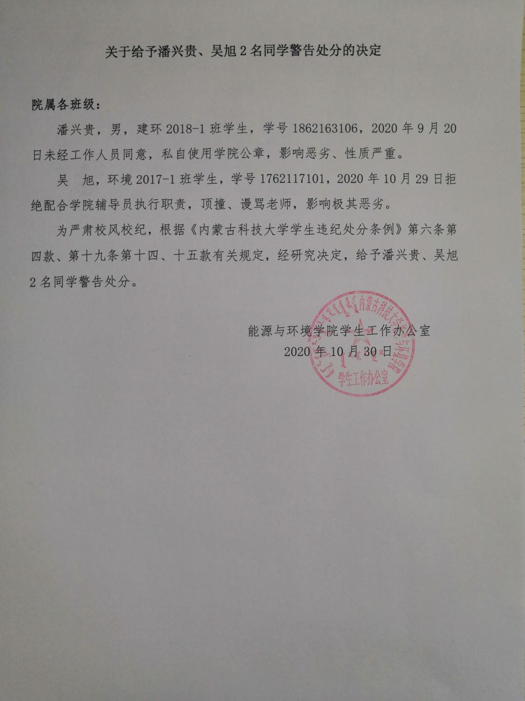 关于给予潘兴贵、吴旭等2名员工警告处分的决定