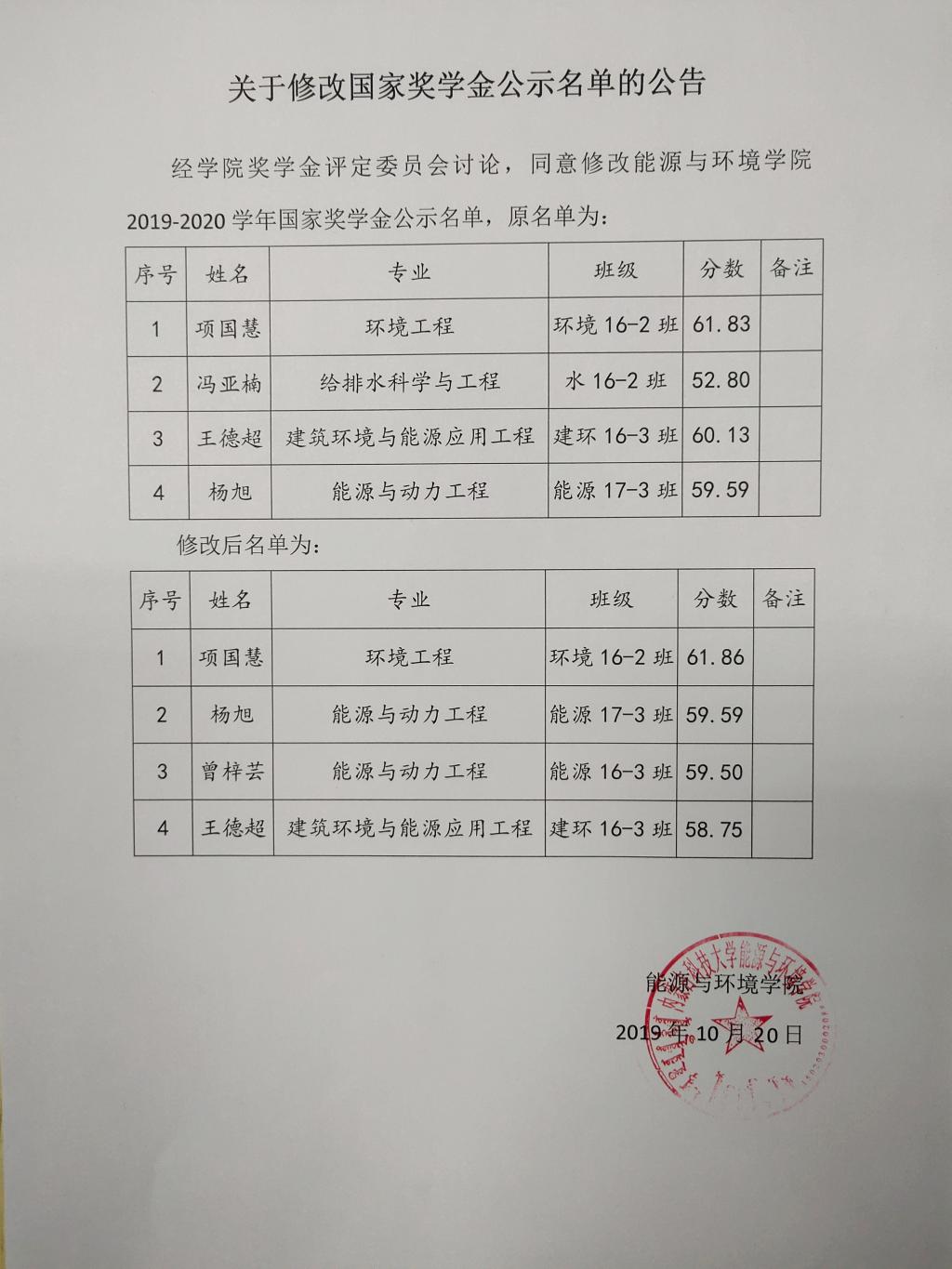 关于修改国家奖学金公示名单的公告